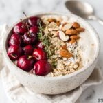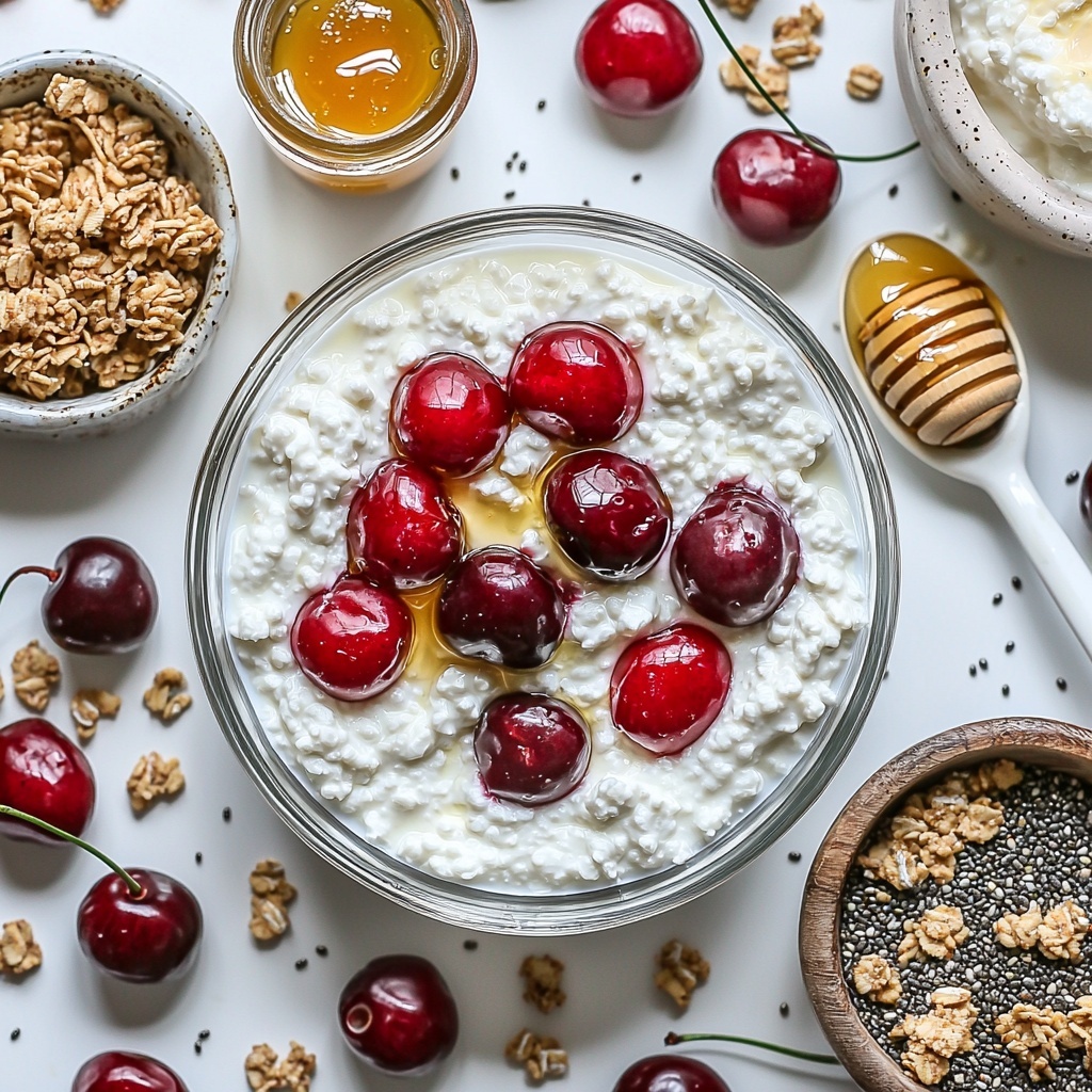 This Cherry Cheesecake Breakfast Bowl combines creamy cottage cheese and nonfat vanilla Greek yogurt with sweet cherries, honey, and crunchy protein cereal for a delicious and nutritious start to your day. Optional almond butter and chia seeds add extra flavor and nutrition, making it a perfect quick and healthy breakfast.