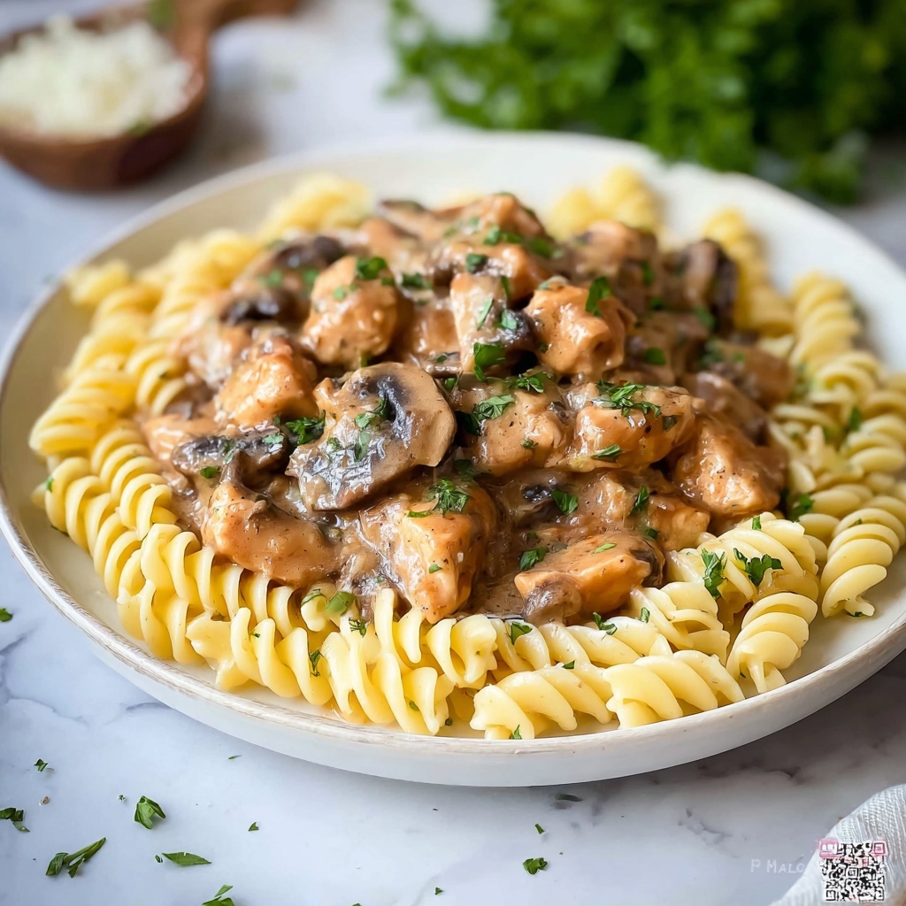 Spoon the rich chicken stroganoff over hot cooked egg noodles that will catch every bit of that delicious sauce. Top with freshly chopped parsley to add brightness and a lovely splash of color. Serve immediately for a meal that feels both comforting and indulgent.