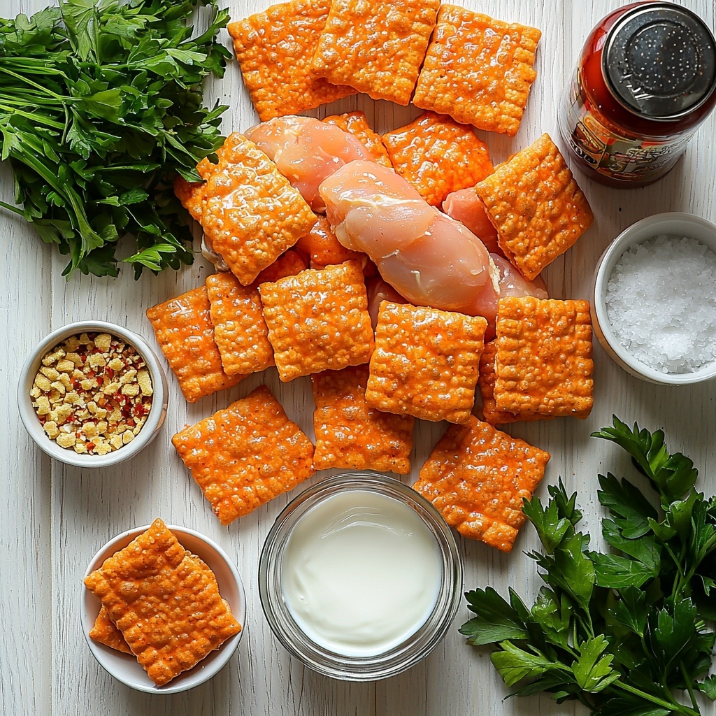 These ingredients come together simply yet thoughtfully, each bringing its own magic to the table to create a harmony of flavor and texture. From the tangy buttermilk marinade to the bold crunch of the Cheez-It coating, every component plays a star role.