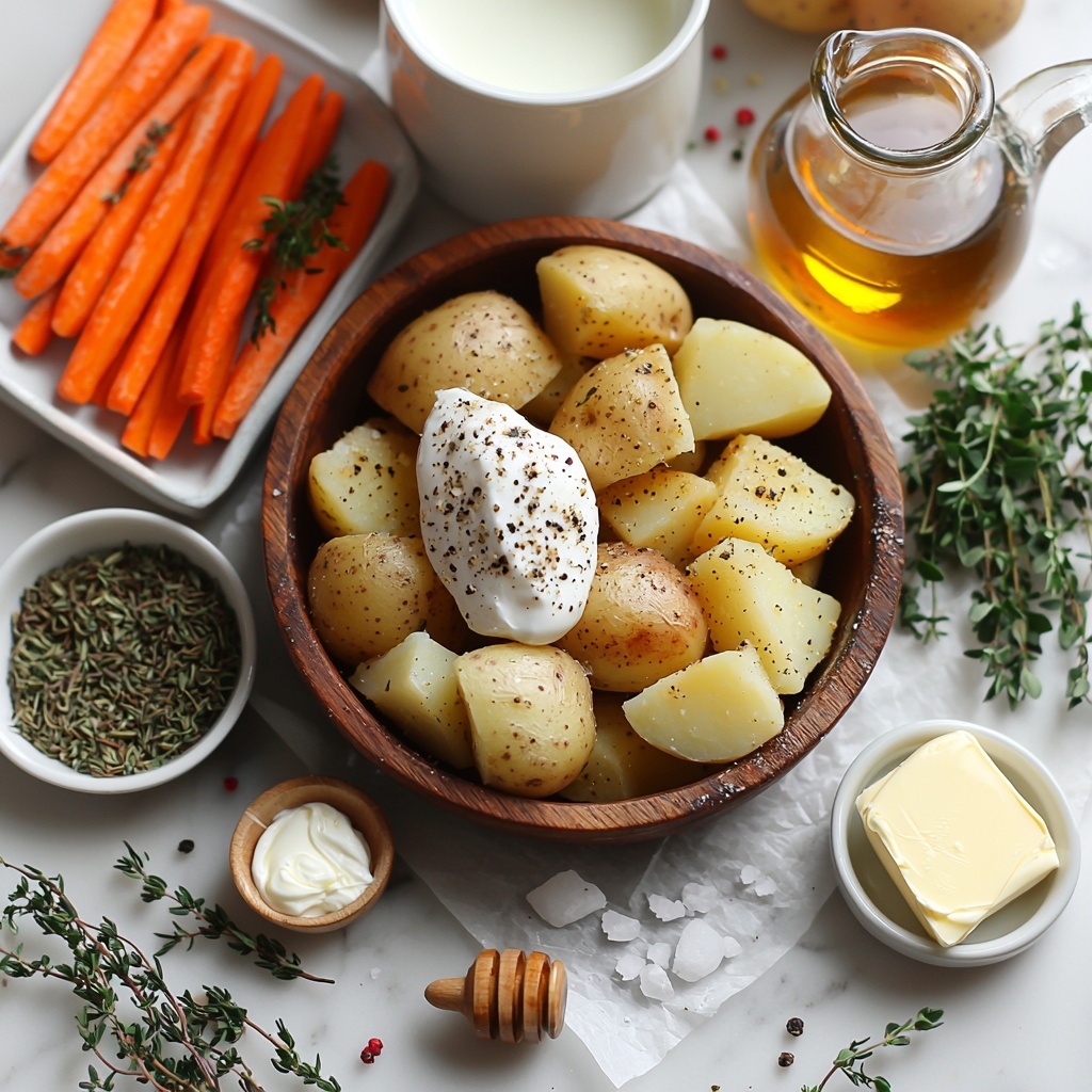While the carrots roast, place your cubed Yukon gold potatoes into a large pot and cover with cold water. Add a pinch of salt and bring to a boil, then simmer for about 15 to 18 minutes until tender enough to pierce easily with a fork. Drain thoroughly and return to the pot. Add the warmed milk, butter, sour cream, the remaining salt, and black pepper. Mash until silky and creamy with no lumps, then keep warm so they stay at serving temperature.