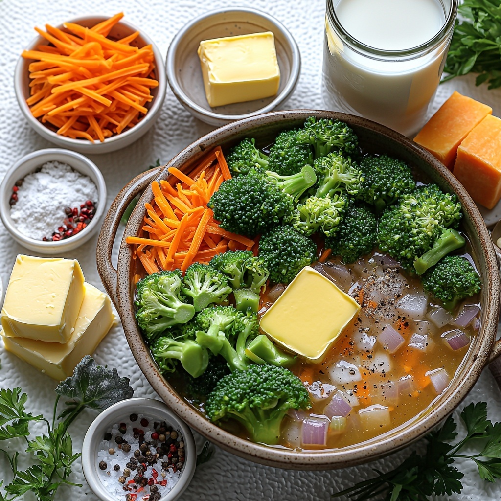 Getting ready to make this soup is a breeze, especially because the ingredients are straightforward yet essential. Each one brings a unique element—whether it’s the richness of butter, the sharpness of cheddar, or the subtle sweetness of carrots—that elevates the whole dish to something special.
